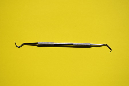 Close-up Dental Instruments on a yellow background. Prevention of oral diseases. Dental tools and equipment.
