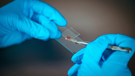 Hands of a gynecologist close-up while applying a smear on the glass. Gynecological analysis