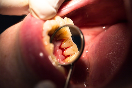 Close Up of Dentist Hand Moving a Decayed Tooth with Dental Instruments before Extraction on Blur Background