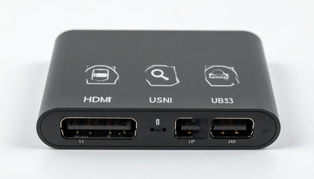 A macro view showcases a high-speed USB hub with multiple ports, highlighting the sleek design and connectivity options against a clean, white backdrop. Ideal for modern tech setups.