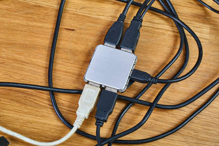 Modern convenient multi-port usb charger for devices. Close-up of inserted multi-colored cables in a power outlet. Macro.