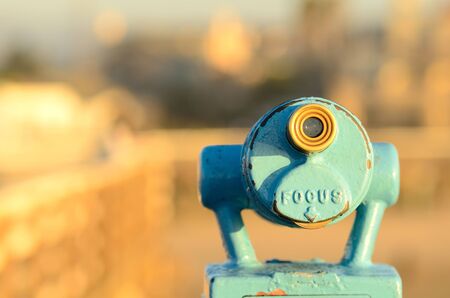 Tower viewer turned towards Neva river in Saint-Petersbourg, Russia. Tourist destionations image. Sightseeing binocular against blurred background of city at dawn in light of sunset.