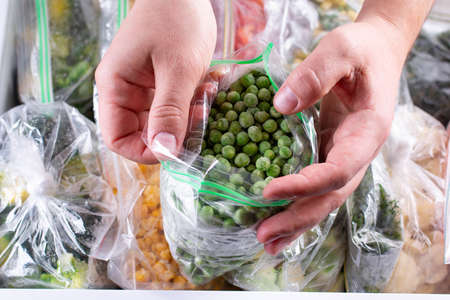 Frozen green peas. Frozen vegetables in a plastic bag in freezer