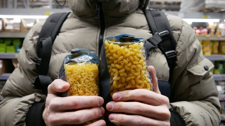 Two packagings of pasta in the hands of a male buyer
