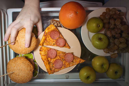 View from top to hand taking the burger from the fridge shelf.