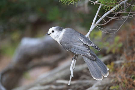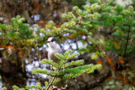 Gray Jay on a conifer branch in the boreal forest, Quebec, Canada.