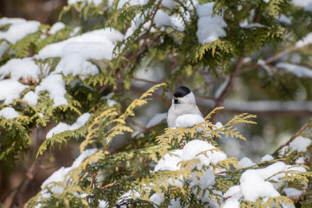 Black-capped chickadee sitting on a branch covered with snow