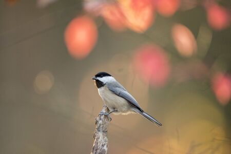 A cute Carolina Chickadee perched on a dead stump glowing in the sun with out of focus glowing red and pink leaves in the background.
