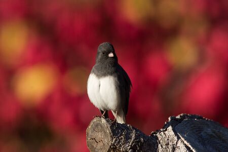 Dark-eyed Junco perched on a tree stump in Wisconsin in the autumn.