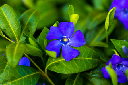Blue botanical periwinkle plant or vinca minor flowers in spring garden close up
