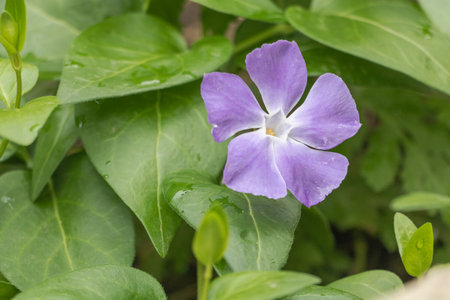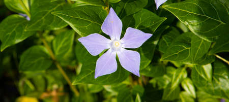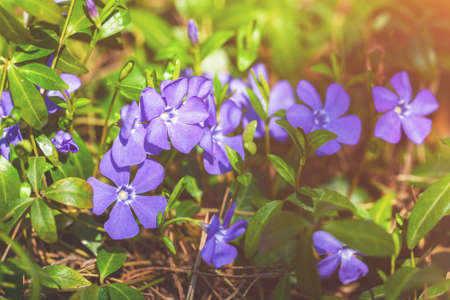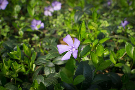 Beautiful purple flowers of vinca on the background of green leaves. Vinca minor, small periwinkle, small periwinkle, ordinary periwinkle, as decoration of garden. close-up. Concept of nature for design.