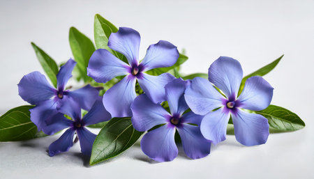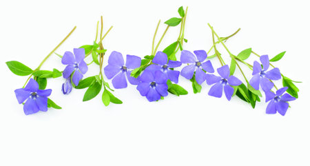 Flowers composition, copy space. Periwinkle flowers isolated on white background. Vinca minor.