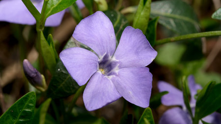 Vinca minor lesser periwinkle flowers in bloom, common periwinkle flowering plants, blue purple color ornamental creeping flower