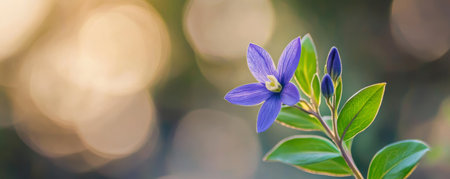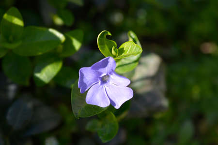 Close-up of an isolated and blue flower of vinca major with leaves background