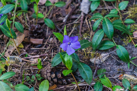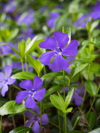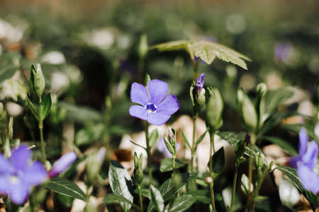 Ornamental plant Lesser periwinkle (Vinca minor) blooming with purple flowers, spring in natural park