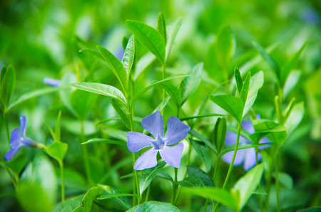 Blue periwinkle flowers with green leaves in early spring in the forest