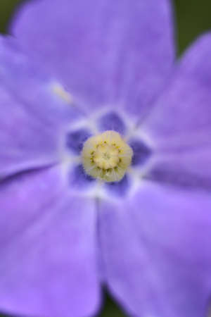 Beautiful macro view of light yellow stigma of blue common periwinkle (Vinca Apocynaceae) flower used in chromo therapy to reduce anger and anxiety, Dublin, Ireland. Soft and selective focus