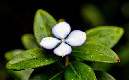 Dew-Kissed Periwinkle: A Delicate Purple Flower with Water Droplets