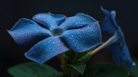 This close-up image showcases a striking blue flower adorned with water droplets. The flower is set against a dark backdrop, emphasizing its vibrant colors and delicate textures. The composition offers visual interest, potentially suitable for decorative, educational, or commercial applications. The lighting highlights intricate details, creating a compelling visual narrative.