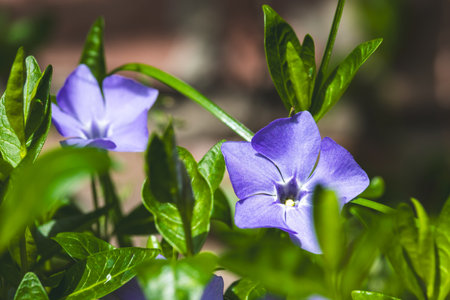 Beautiful purple flowers of vinca on the background of green leaves. Vinca minor (small periwinkle, small periwinkle, ordinary periwinkle) as decoration of garden. close-up. Concept of nature for design.