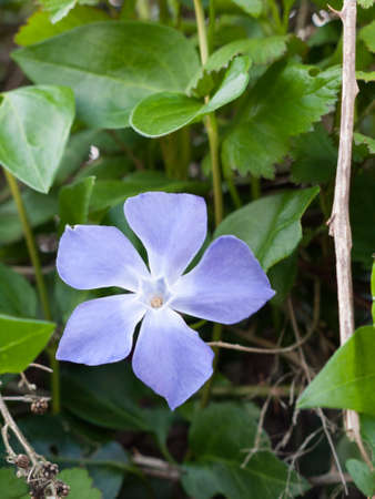 Vinca minor flower growing in field, close up shoot