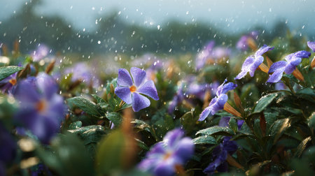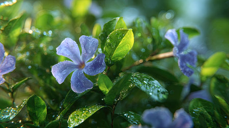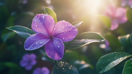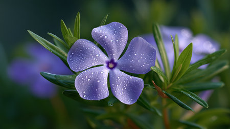 Dew-Kissed Periwinkle: A Delicate Purple Flower with Water Droplets