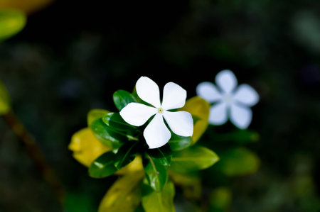 White Rose Periwinkle (Catharanthus roseus) with water pearls on petals, tropical flower known for its ornamental beauty and use in natural herbal remedies and traditional medicine