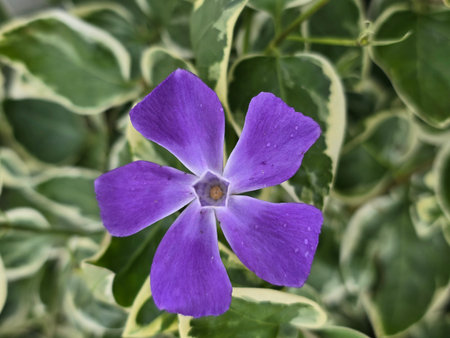 Vinca major flower, with the common name bigleaf periwinkle, growing in the garden.
