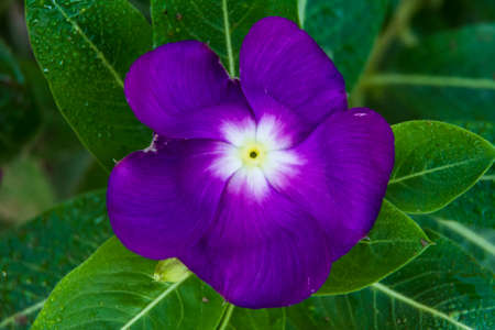 Vinca flower with its green leaves, top view