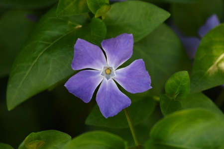 Creeping early flowers. Common periwinkle flowering plant. Vinca minor lesser periwinkle ornamental flowers in bloom.
