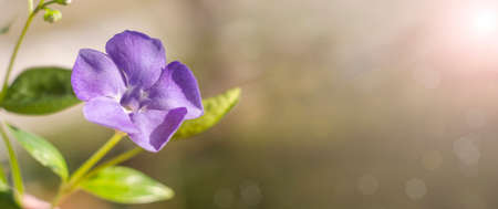 Background banner with copy space. Purple flower with selective focus on a green background with the sun. Birthday card, Mother's Day, March 8th. For summer lettering.