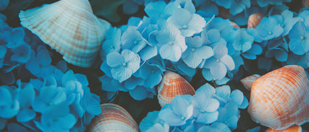 Beautiful blue hydrangeas mixed with seashells for a beach-inspired flat lay display