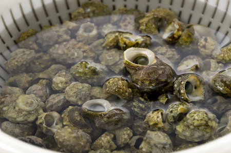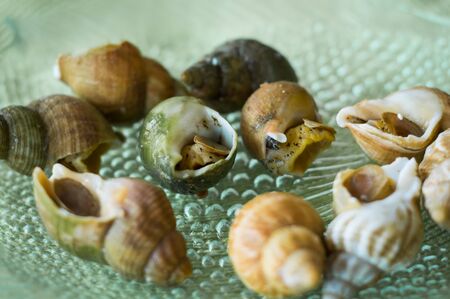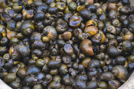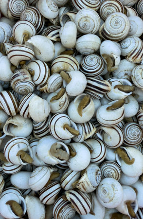 Closeup of fresh edible snails with spiral striped shells commonly used in Mediterranean cuisine