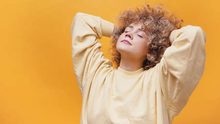 Beautiful relaxed girl with hands behind her head and eyes closed. Having break concept. Dressed in a big yellow sweater. Isolated over bright yellow background studio.