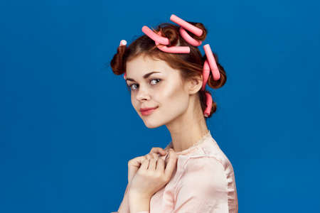 Woman on blue background, housewife, hairstyle, hair curlers, portrait.