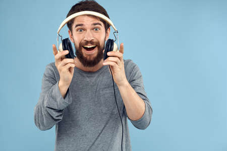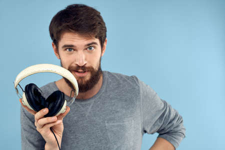 Man with headphones in hands music emotion technology lifestyle fun blue background close-up