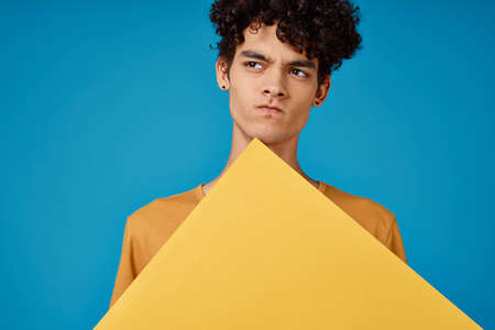 happy guy with a comb in his hand on a blue background and curly hair brunette model