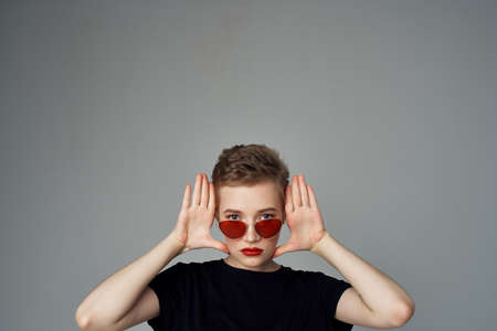 short haired woman hand gesture Red lips glamor dark background