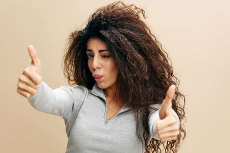 Best choice. Happy Latin lady in sunglasses showing thumbs up gesture with both hands, approving or recommending something good, posing isolated on pastel beige studio background wall, banner
