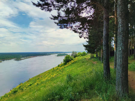 beautiful landscape from the mountainside near the river against a wonderful blue sky with clouds