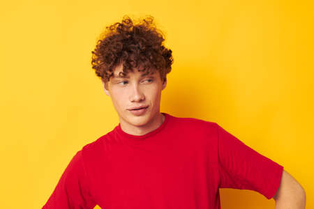 cute red-haired guy red t shirt fun posing casual wear isolated background unaltered