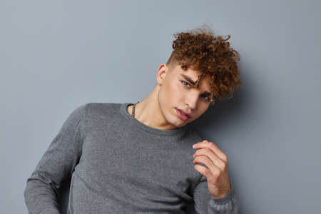 Cheerful guy with curly hair tilts his head to the side on a gray background photostudio model