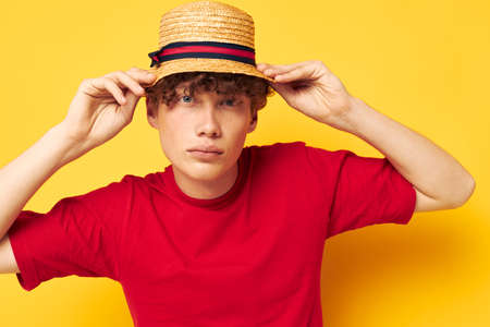 portrait of a young curly man in a red t-shirt with a fashion hat Lifestyle unaltered