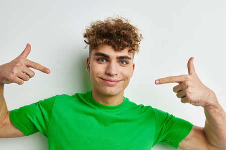 kinky guy in green t-shirts emotions posing isolated background