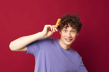 portrait of a young curly man posing hairbrush personal care Youth style