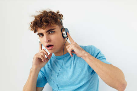 Man in headphones listens to music lifestyle modern style technology light background