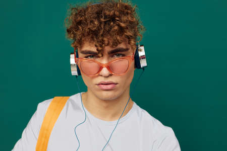 a joyful man, a teenager, stands on a green background listening to music in headphones with pink glasses on his face and looks at the camera