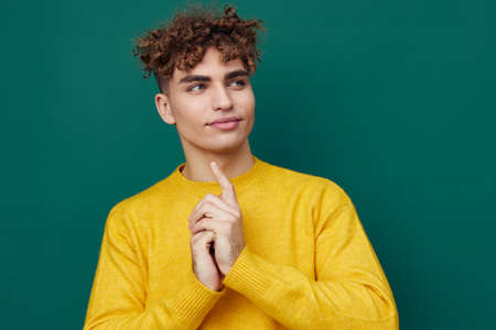 a cute, thoughtful man stands on a green background in a yellow sweater holding his hand to the will of the face. Horizontal photo with empty space