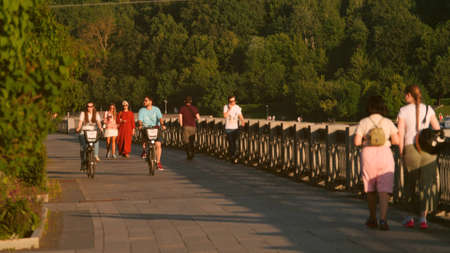 MOSCOW, RUSSIA - JULY 5, 2021. Slow motion shot of people on the Luzhniki park embankment in the summer evening