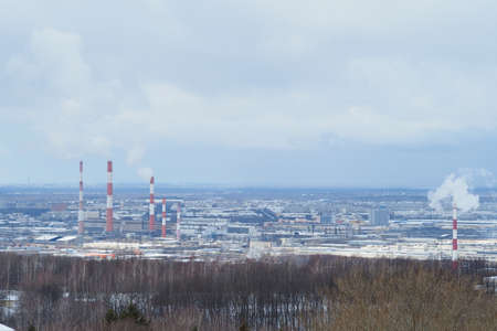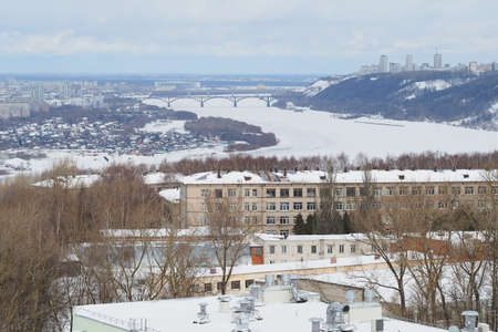 Panoramic view from above of a large industrial city by the river in winter. High quality photo